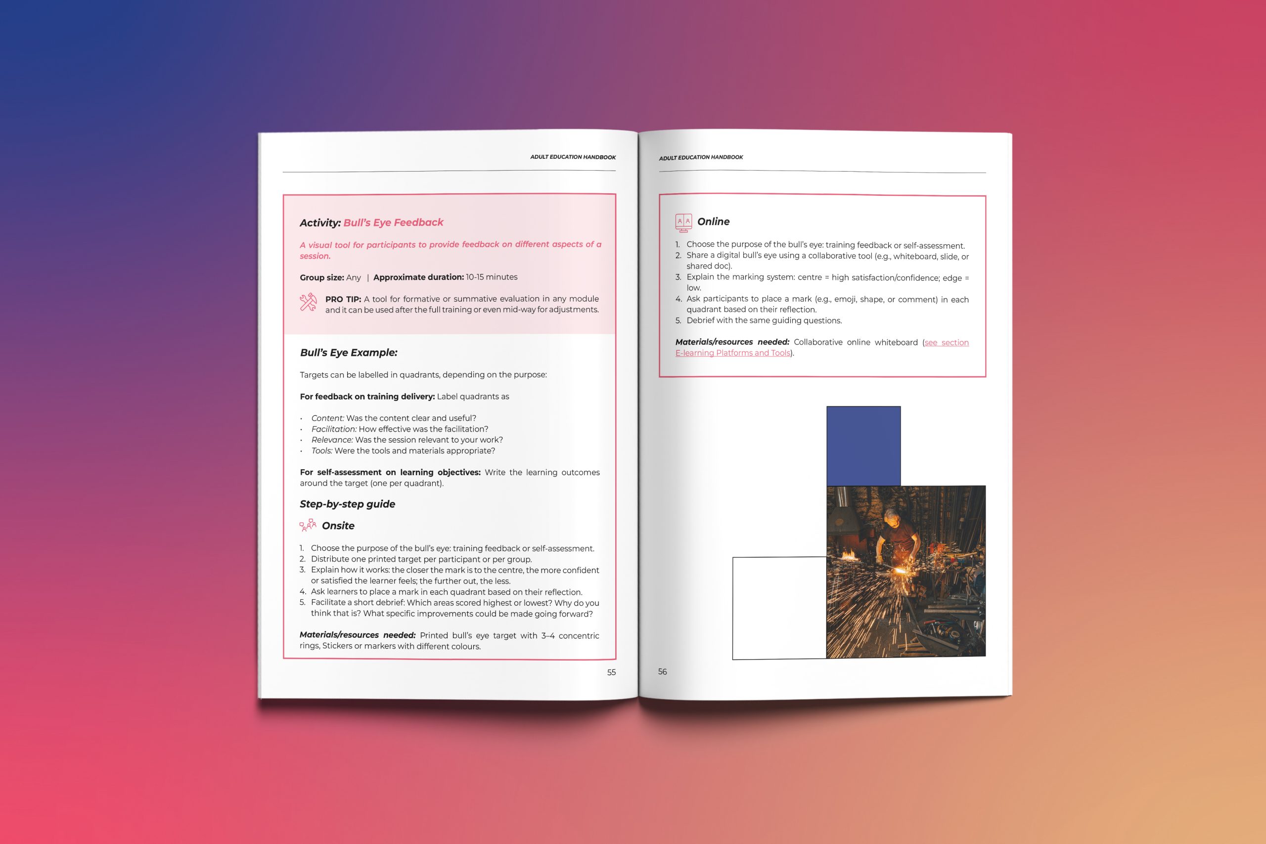 The layout is inspired by Piet Mondrian, reflected in its geometric shapes and division lines. The recurring “building block” motif symbolizes growth and aims to encourage adults to pursue further education for personal development.